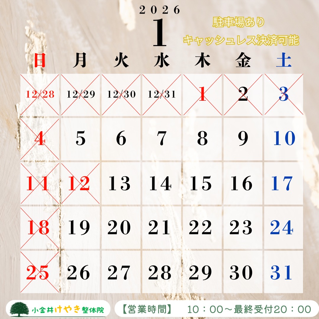 2026年1月のお休みで日曜日以外は1日(木)、2日(金)、3日(土)12日(月)になります。